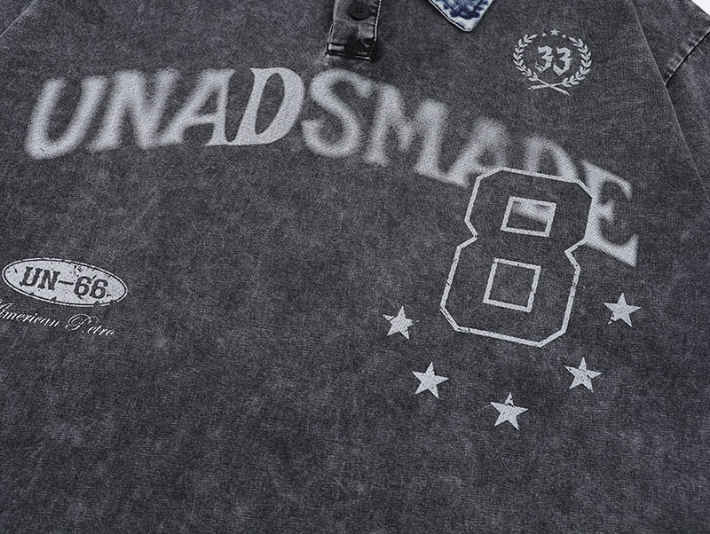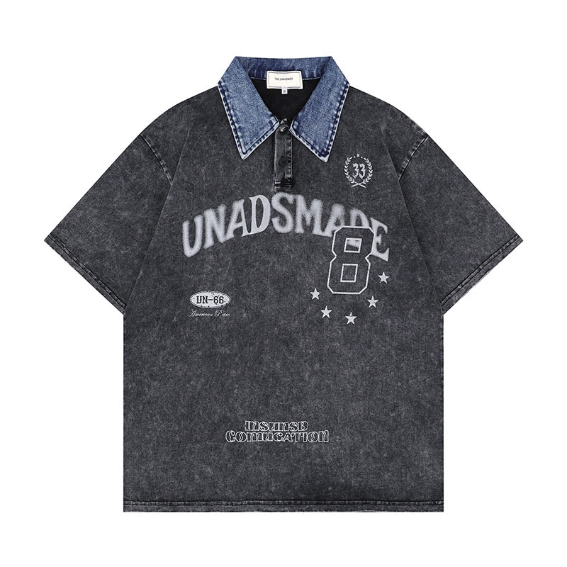Distinguiti con questa T-shirt oversize unisex, perfetta per chi ama lo streetwear e lo stile vintage. Il colletto in denim effetto lavaggio dona un tocco grunge retrò, mentre la stampa con lettere e grafiche ispirate al mondo sportivo crea un look originale, casual e super contemporaneo.
